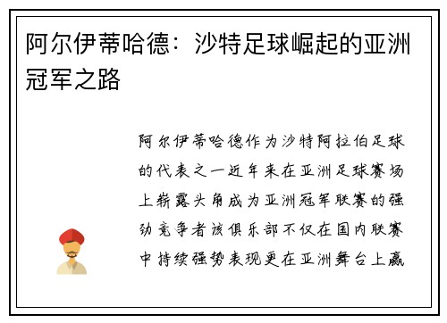 阿尔伊蒂哈德:沙特足球崛起的亚洲冠军之路