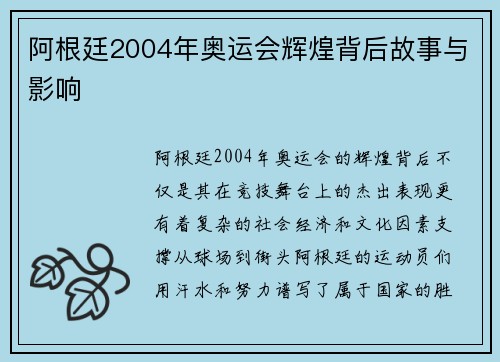 阿根廷2004年奥运会辉煌背后故事与影响